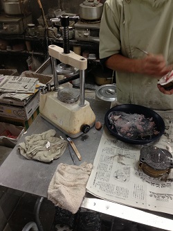 フラスコという金属の型枠の中に模型と石膏などを流し込み上下のパーツを
