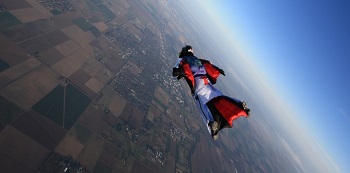 ウイングスーツを着てスカイダイビングのように飛ぶウイングスーツフライング。